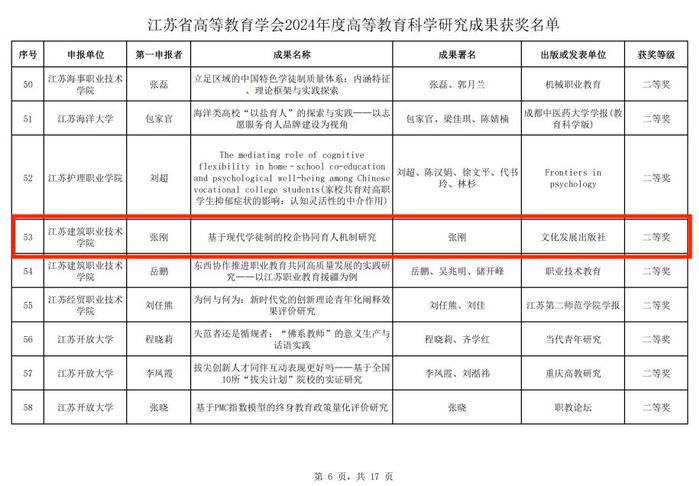 根据《关于公布2024年度高等教育科学研究优秀成果奖的通知》(苏高教会〔2025〕25号),公司张刚博士主持的《基于现代学徒制的校企协同育人机制研究》获得江苏省2024年度高等教育科学研究优秀成果奖二等奖,此次评选由江苏省高等教育学会组织,共收到全省97所高校推荐的论文、著作和报刊文章等459项,最终评选出特等奖9项、一等奖22项、二等奖129项,合计奖项160项。